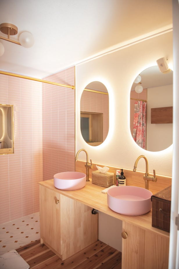 골드 수전과 핑크 세면대가 조화를 이루는 욕실은