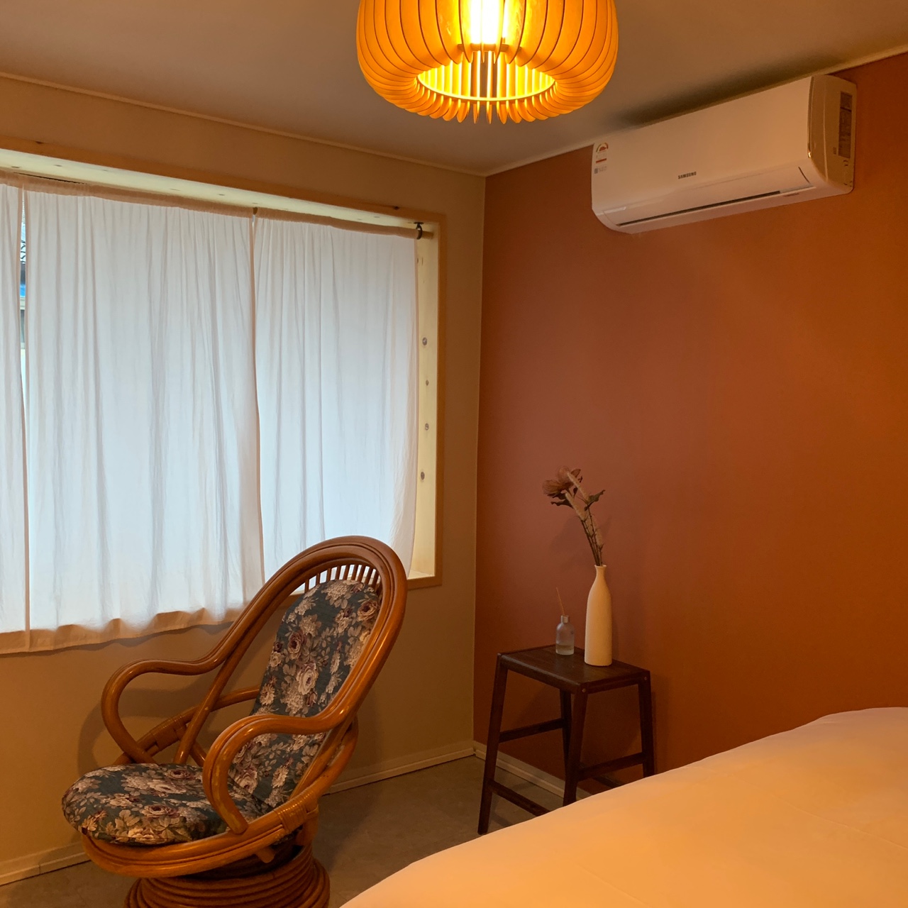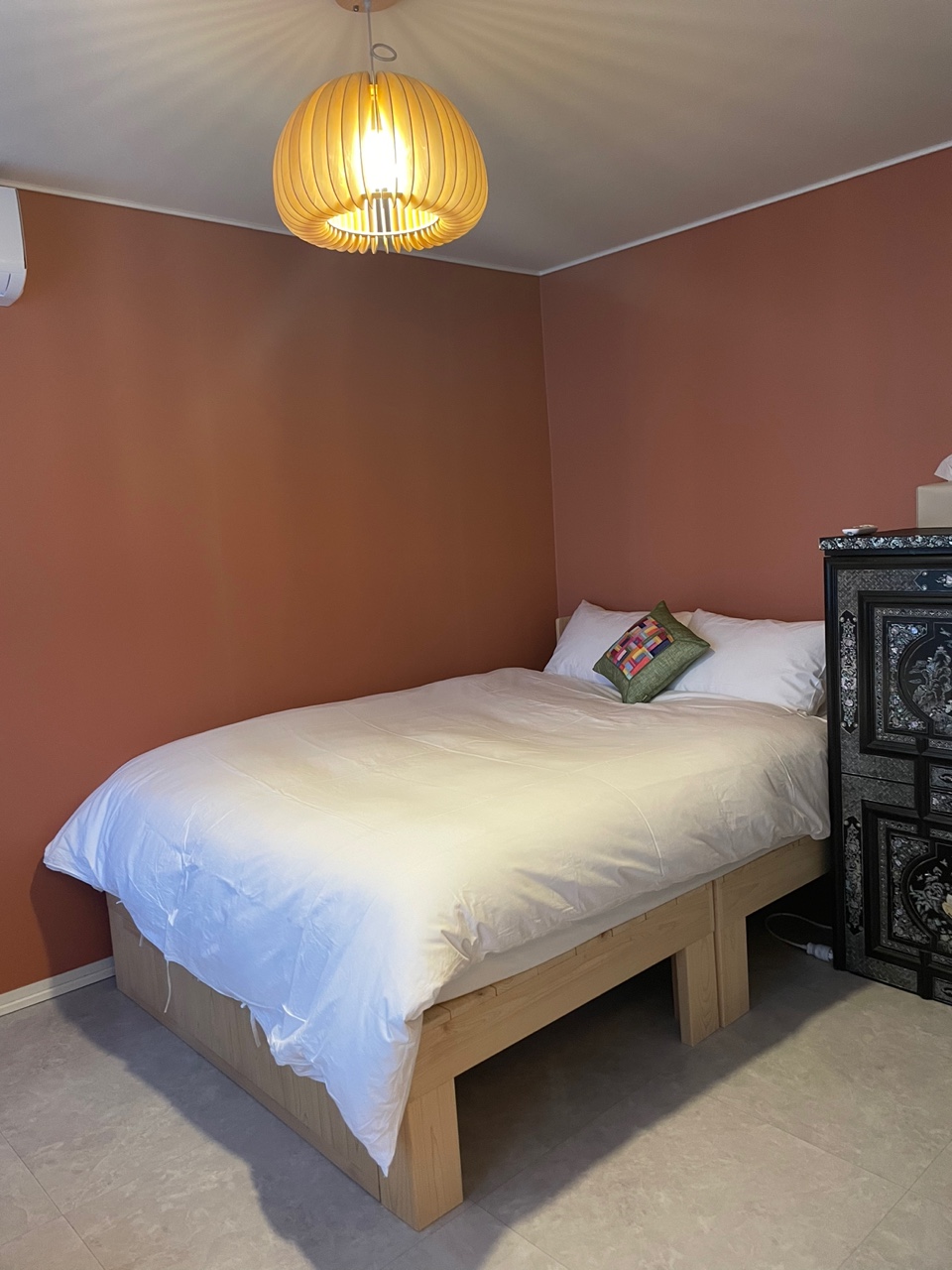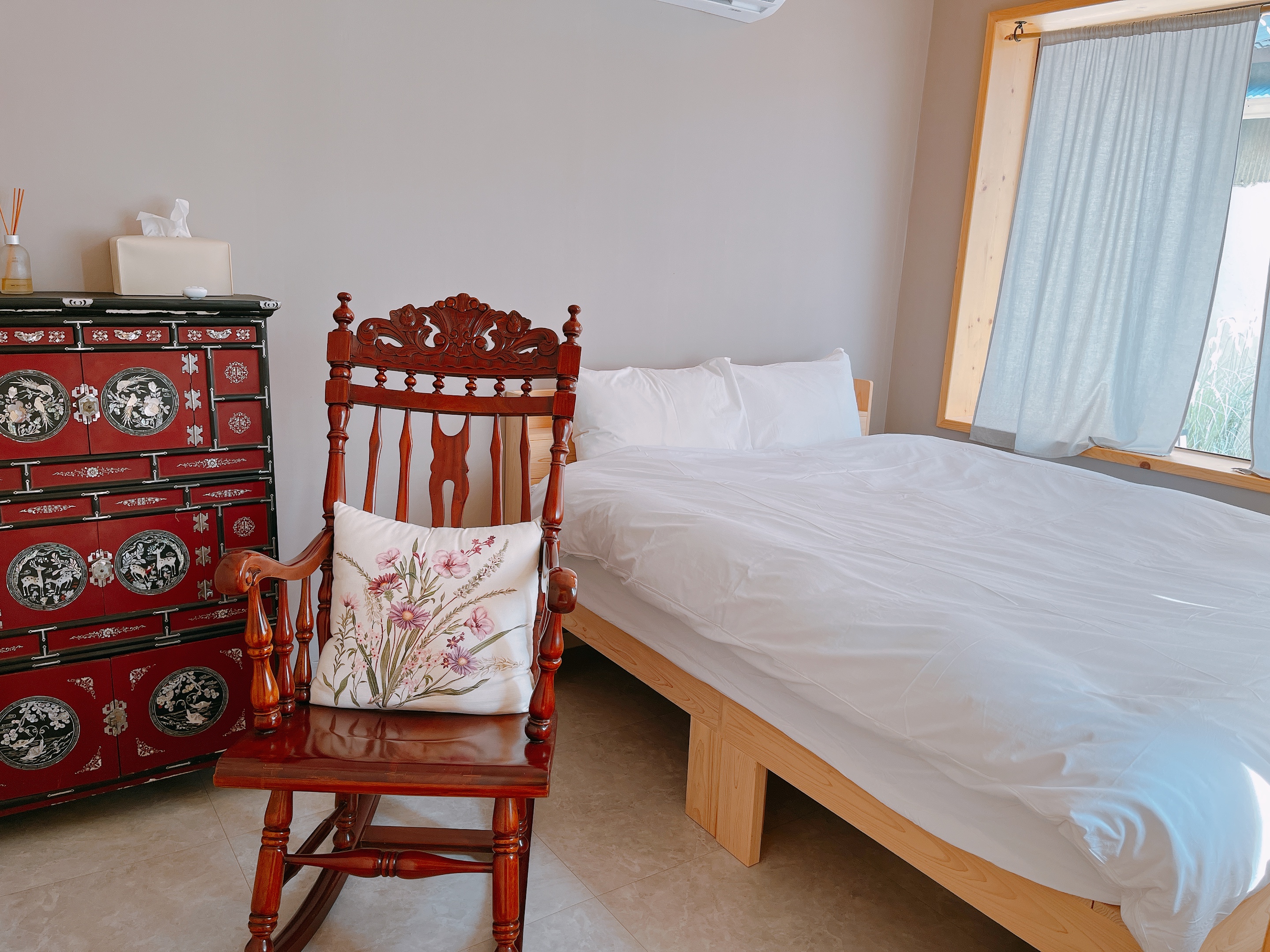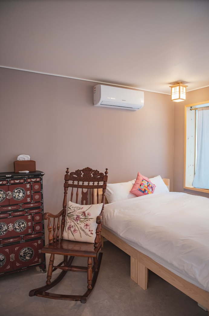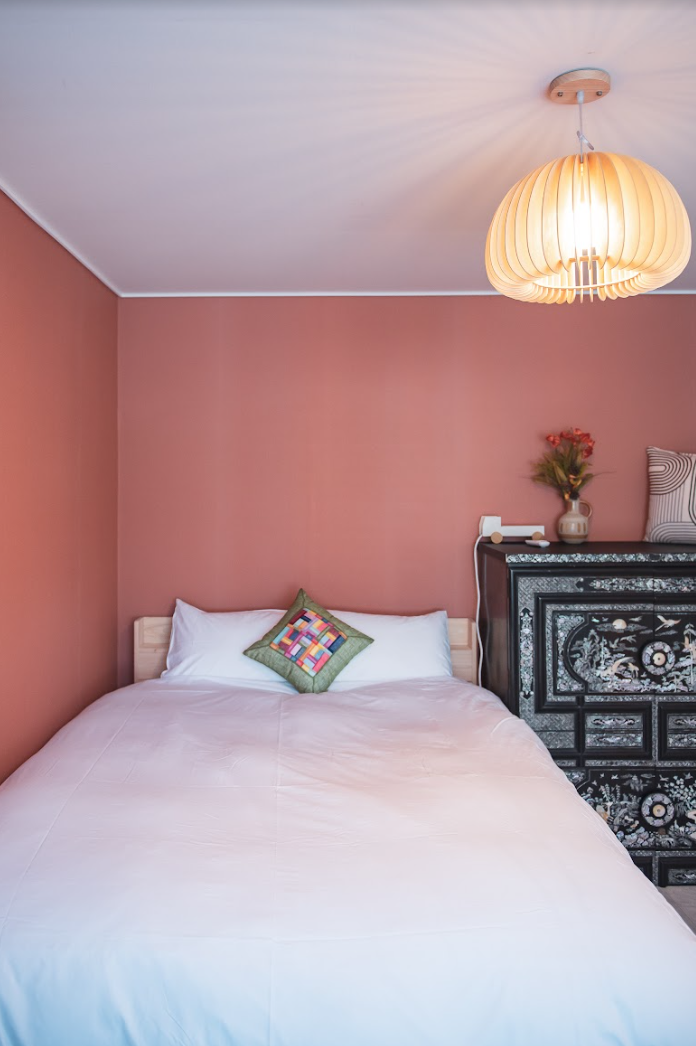 잠시 과거로 넘어간 듯한 착각을 일으키는 옛날 느낌의 유유가 침실 가구와 기분 좋은 향은 공간을 더욱 힙하게 만들어 줍니다.