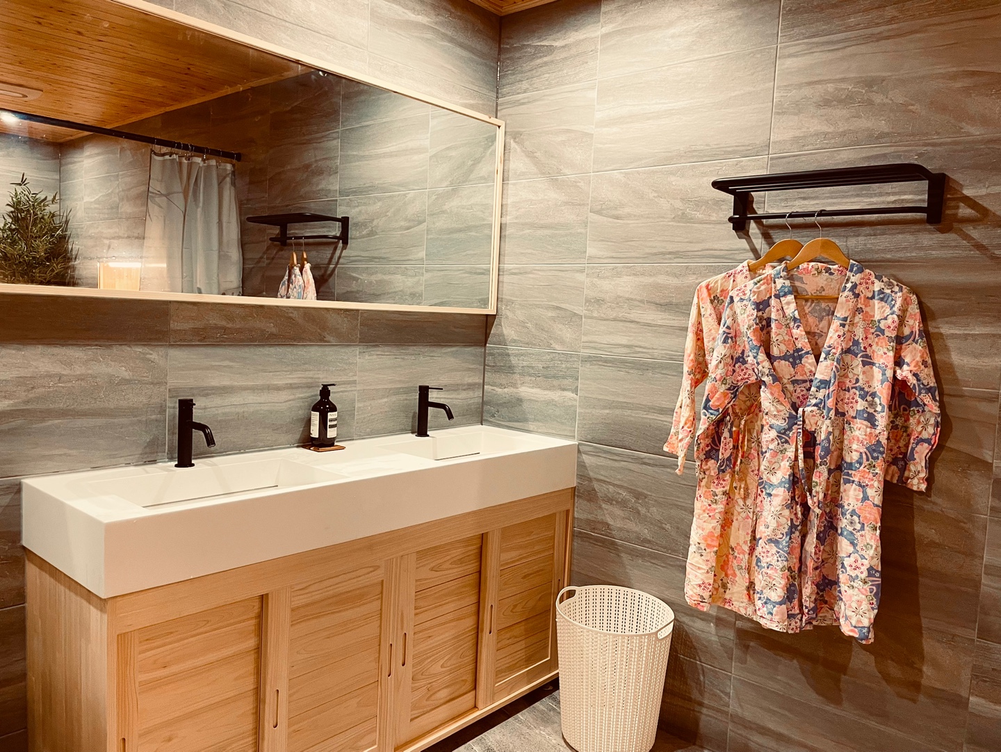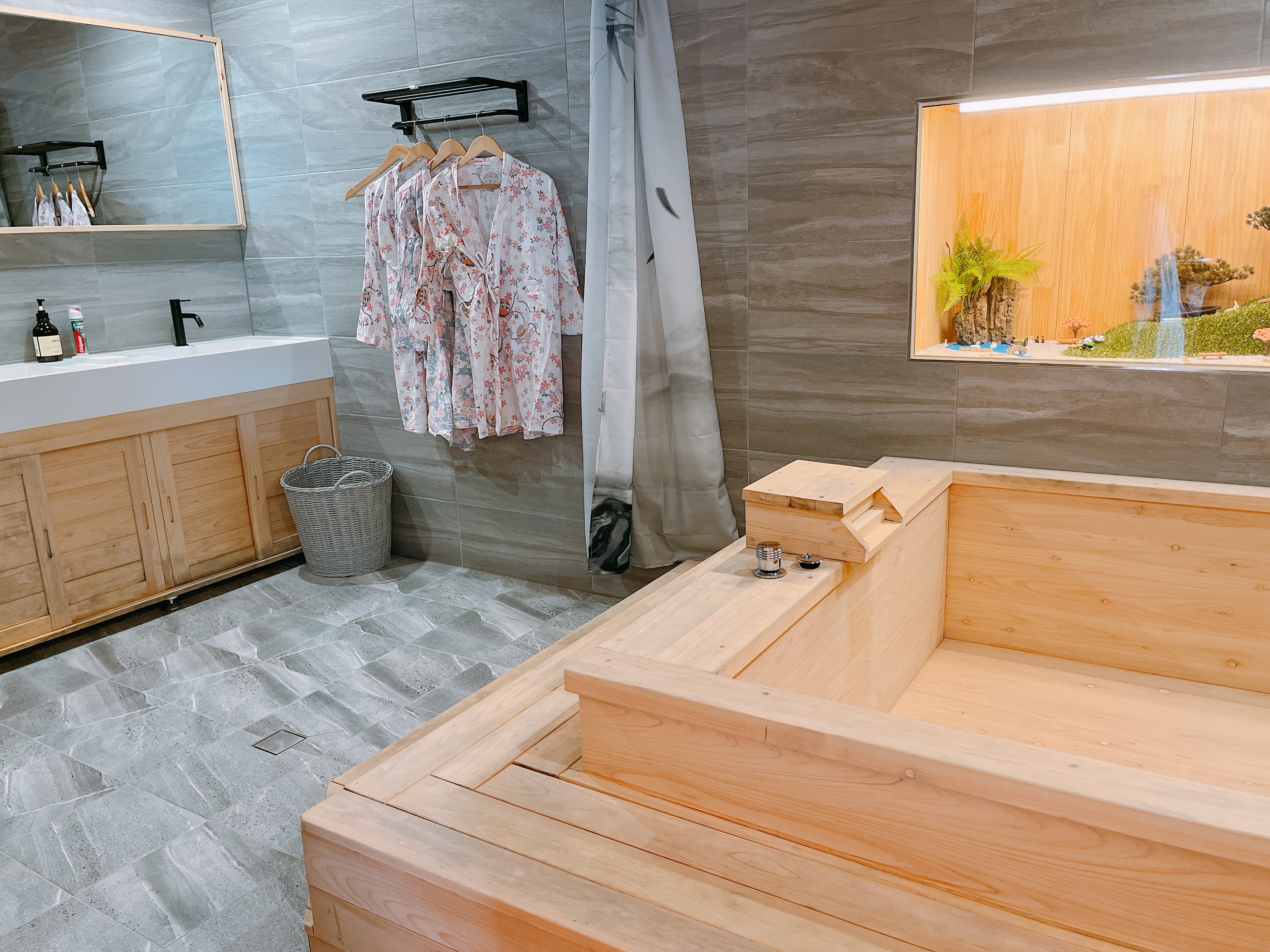 유유가의 히노끼 탕은 편백나무 향 가득한 널찍한 실물파 욕조인데요. 최고급 수입 통 원목으로 제작된 널찍한 욕조와 귀여운 유카타 가운이 비치된 욕실은 공간 자체도 정말 넓어서 유유가에서 제일 자랑하는 공간입니다.