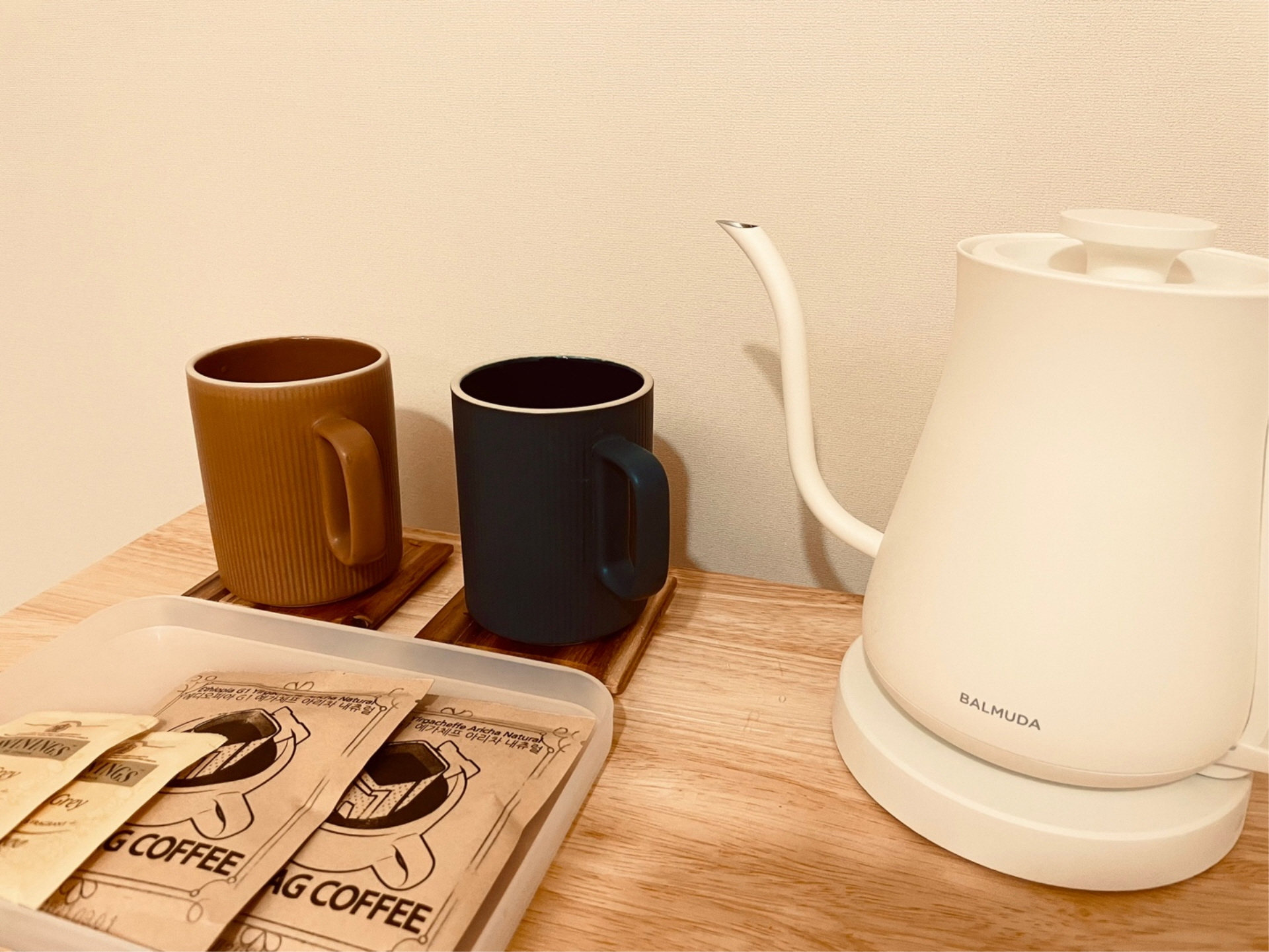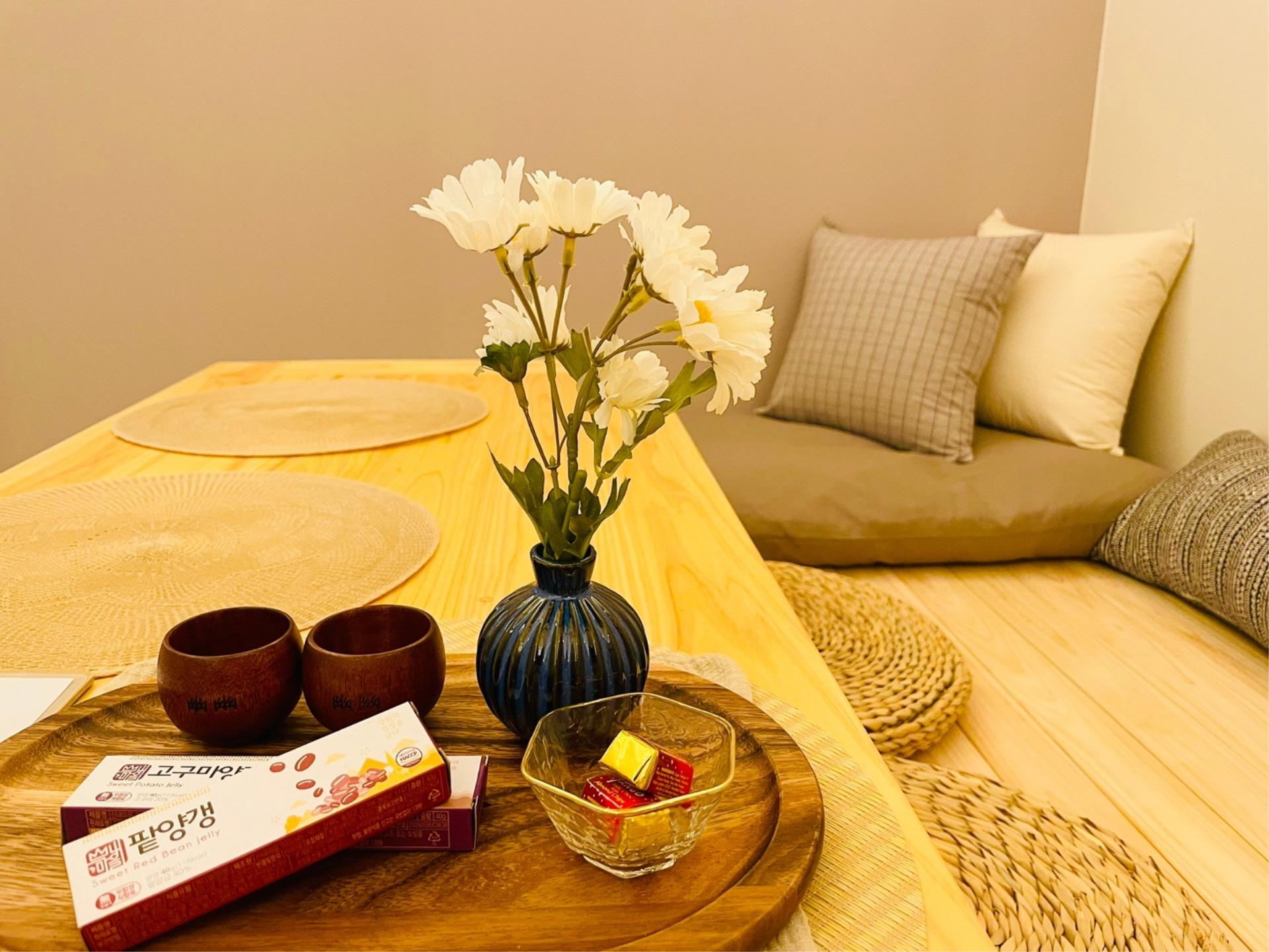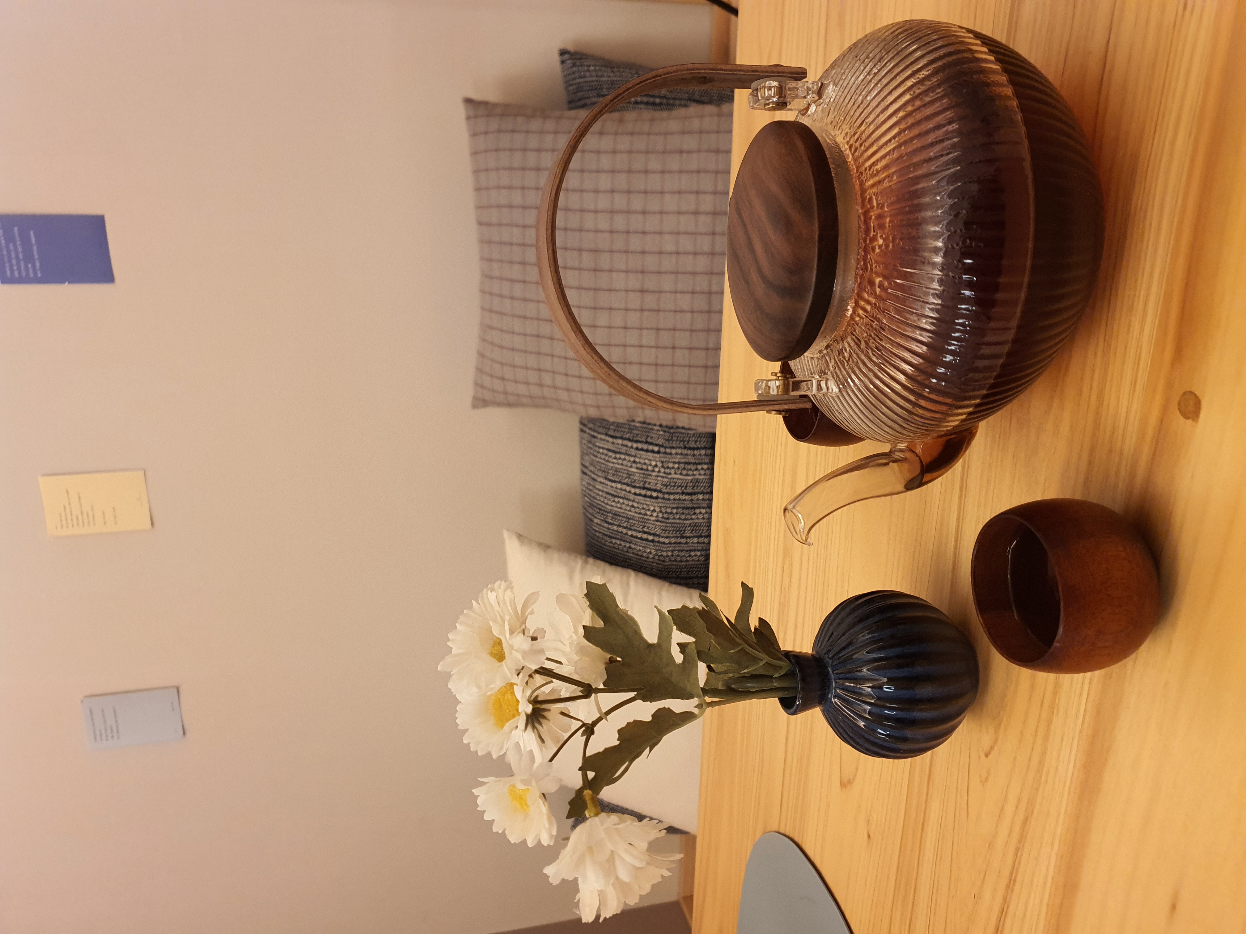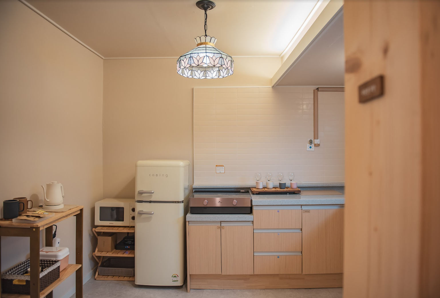 와인을 음미할 수 있는 와인잔, 티타임을 위한 찻잔과 간단한 마들렌 등의 간식, 잠깐 문화의 거리에서 맛있는 순천 먹거리를 사다 먹을 수 있게 간단한 취사용품들도 준비해 두었습니다.