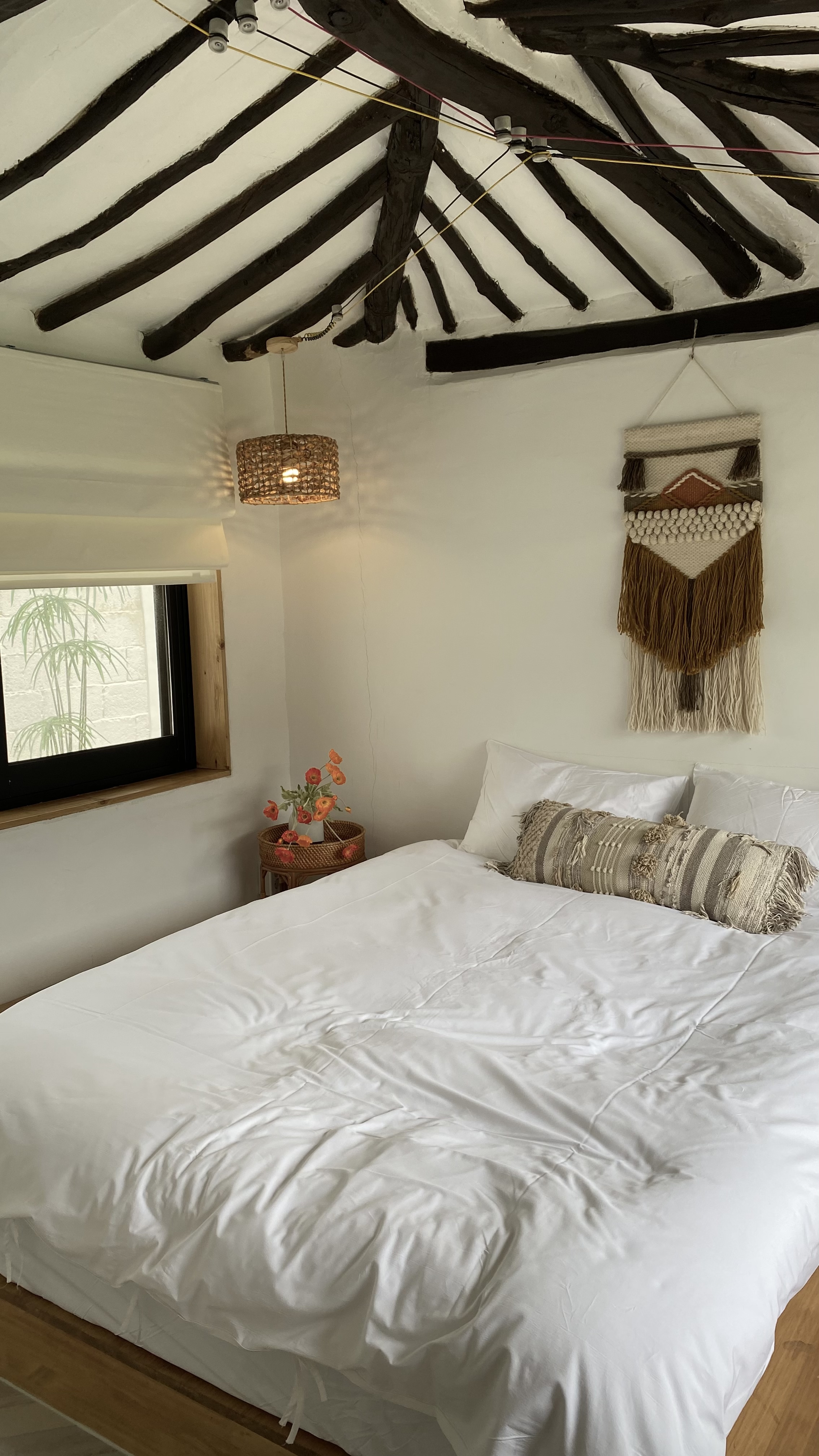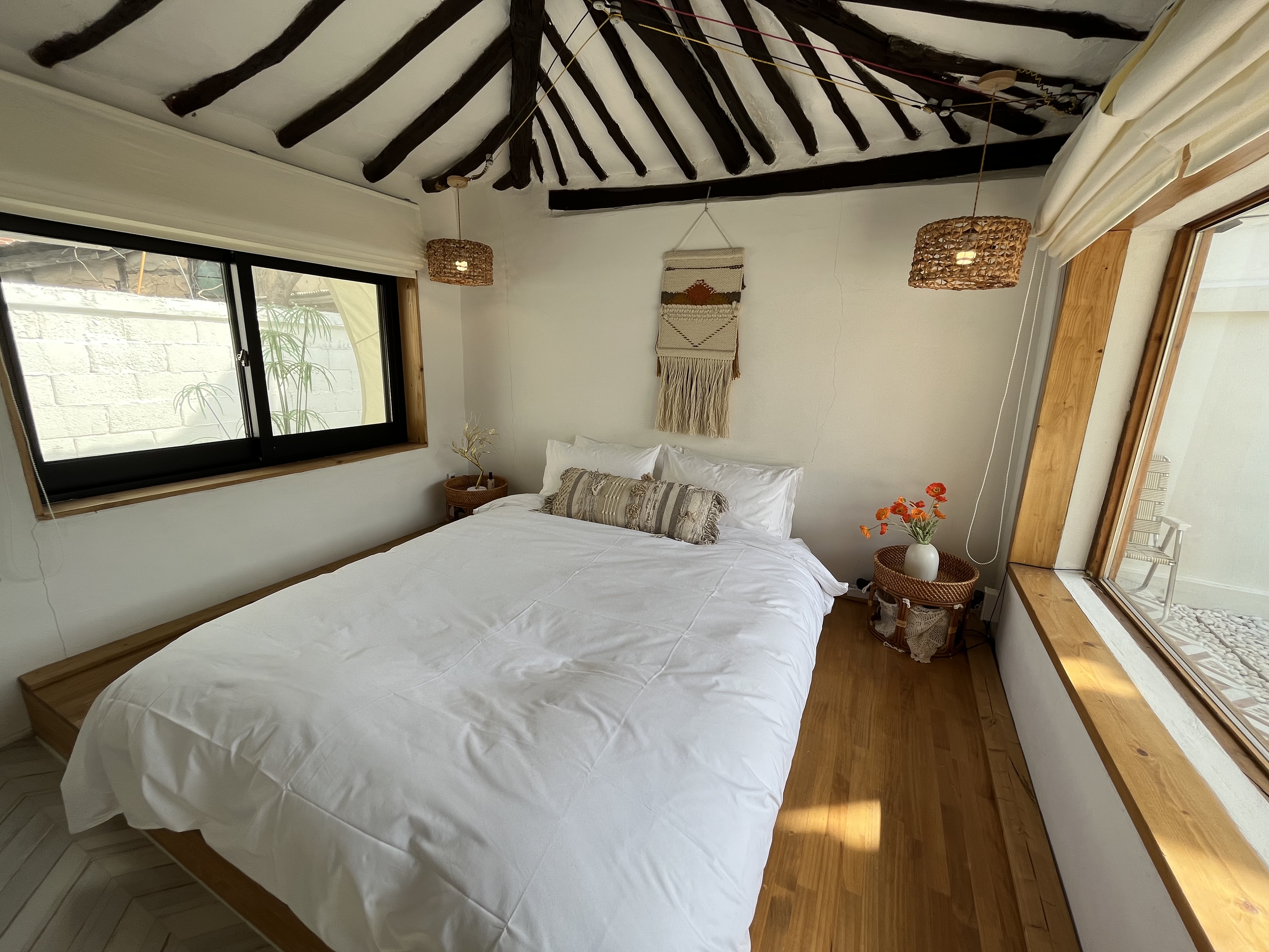 일단 숙소자체가 이쁘고, 늦게 체크인 했는데도 만족감이 높았어요! 아쉽지 않은 시간이였어요!! 침대도 푹신하고, 비치되어있는 컵, 그릇 작은 소품들에 신경쓴게 느껴졌어요!! 침대옆에 큰 창문이 있는데 블라인드가 있어서 다행이다 싶었어요! ㅎㅎ 바로 근처에 편의점도 있어서 좋았고, 한옥 특성상 벌레는 좀 있으나, 에프킬라가 있어서 뿌렸고, 예민하신분은 좀 힘들것 같아요!!