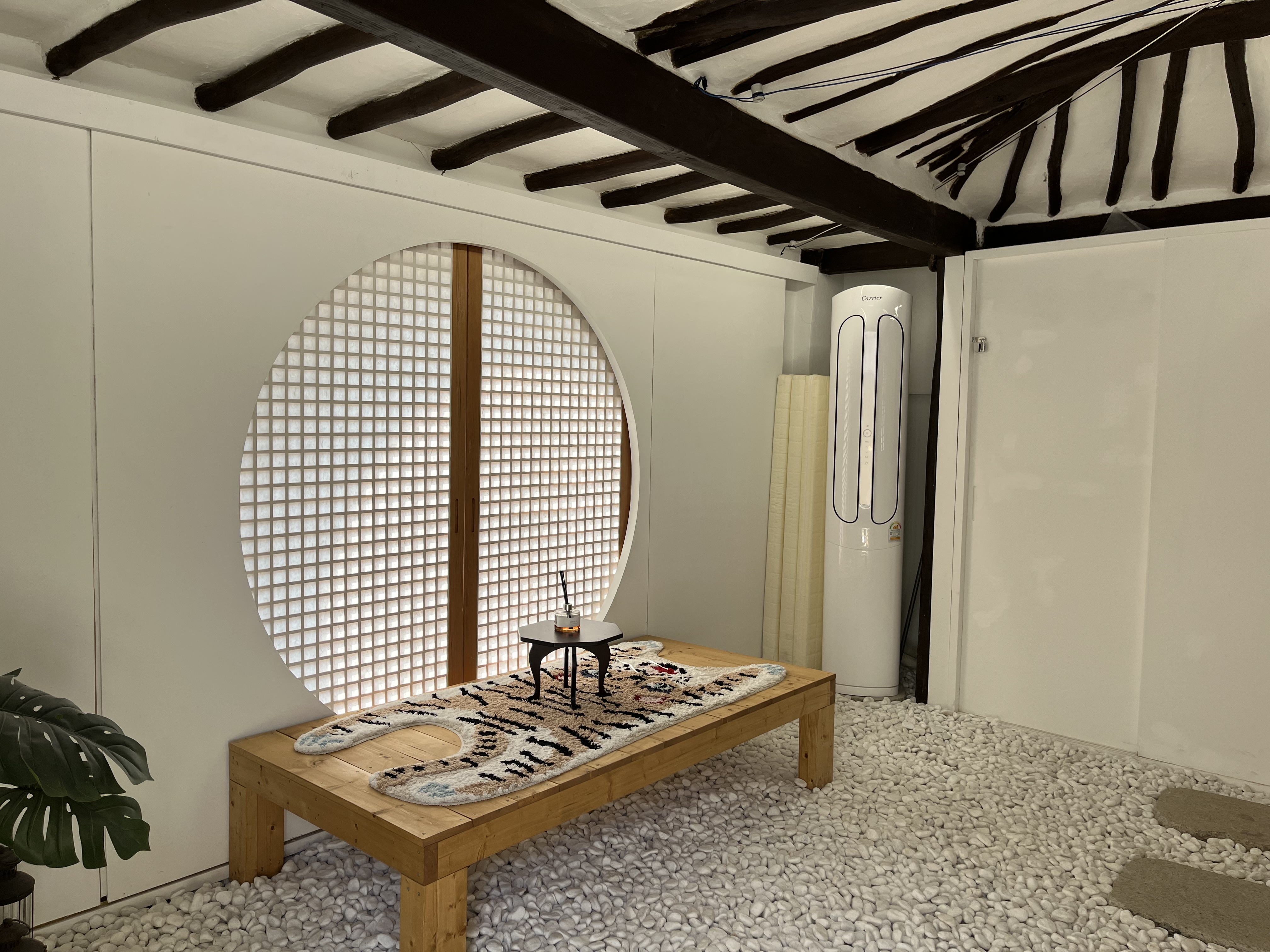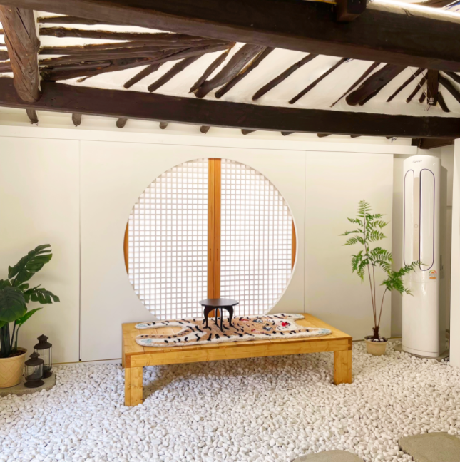 원형격자무늬 창이 호담의 포인트에요. 짐 풀고 국화차 한잔하며 여유를 즐겼습니다. 자쿠지도 꽤 넓어 성인3명 정도는 들어갈 수 있어요. 극성수기라 그런지 에어컨 청결은 살짝 아쉬웠어요.