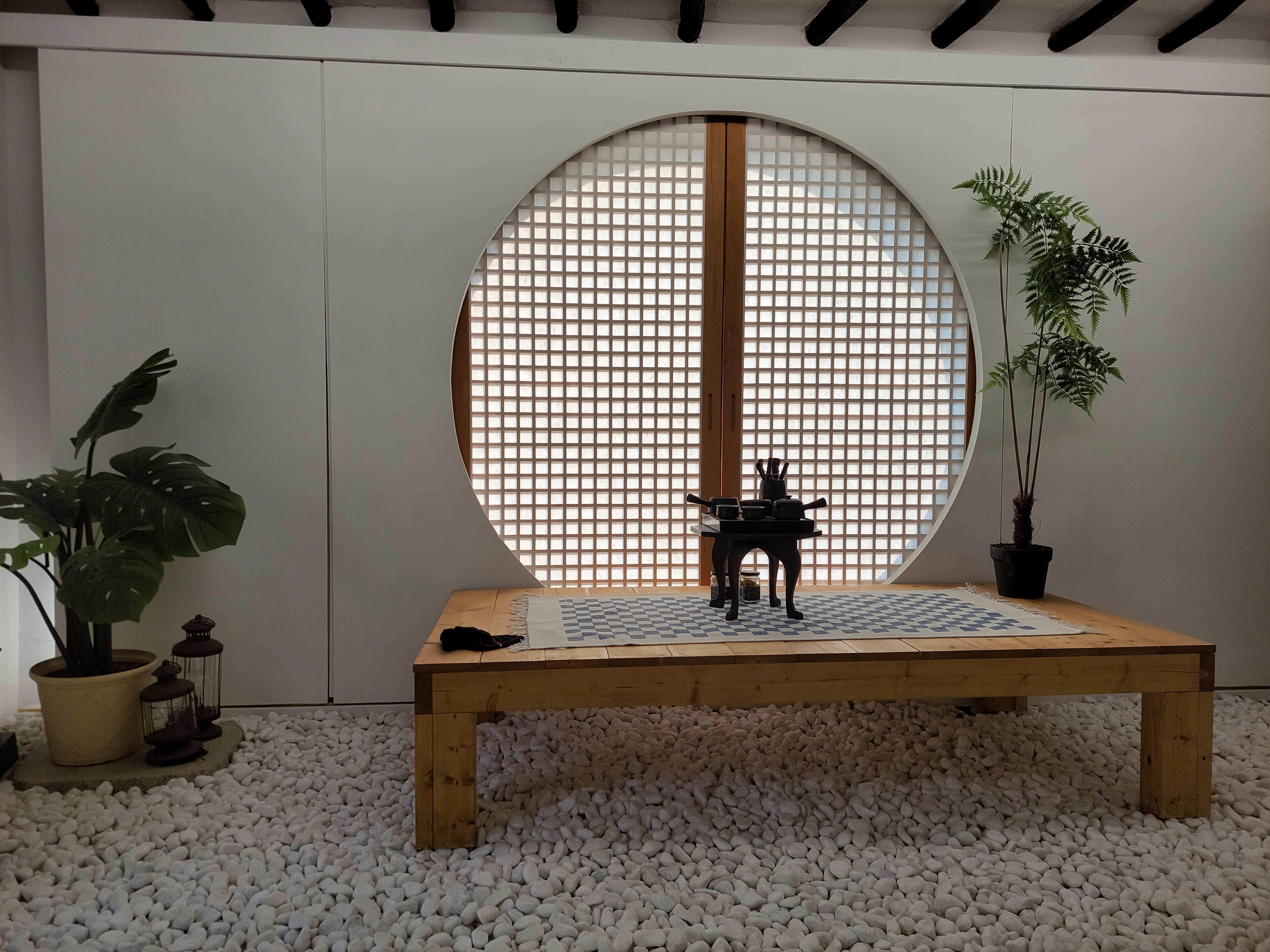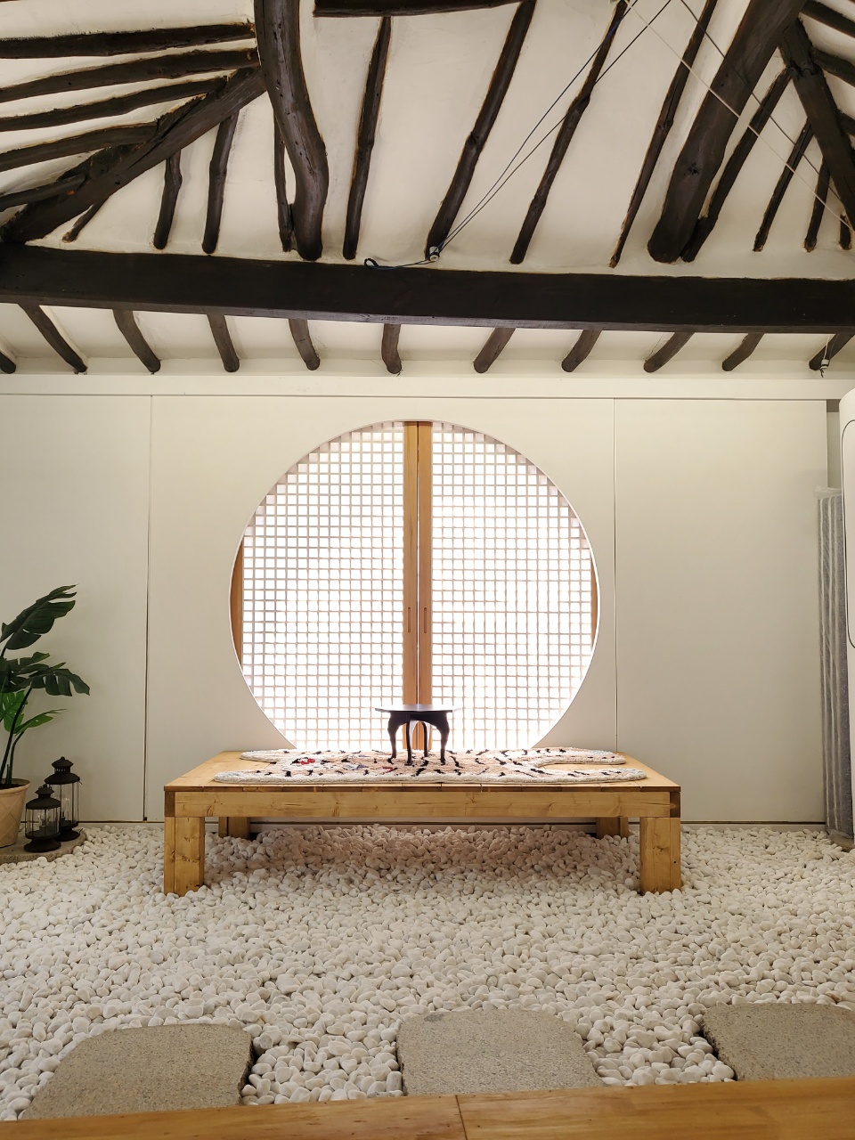 동그란 자갈밭 위 매력만점 평상에는